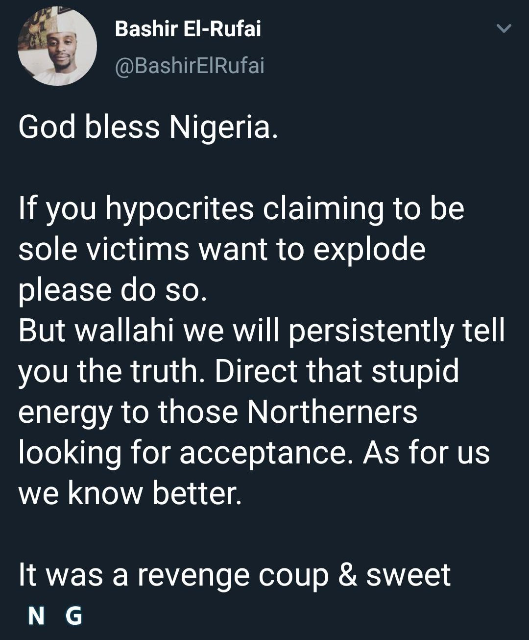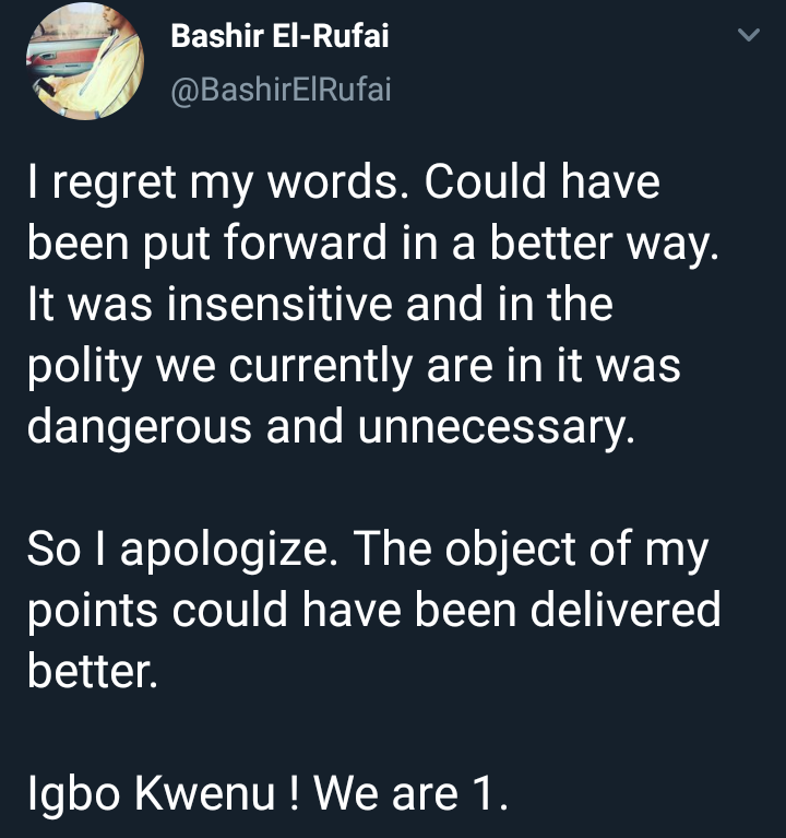 Bashir El Rufai, son of Kaduna state governor, Nasir El Rufai stirred controversy when he described the coup done to a particular region of the country many years ago as sweet revenge. He also stated in his posts that those calling for justice are hypocrites. Nigerians on Twitter who believed he was referring to the Biafran war in which an estimated two million people lost their lives, took out time to call him out for what they described as ''Hate Speech''. read here He has since deleted the tweets and issued an apology which he ended with '' Igbo Kwenu! We are 1.'' I regret my words. Could have been put forward in a better way. It was insensitive and in the polity we currently are in it was dangerous and unnecessary. So I apologize. The object of my points could have been delivered better. Igbo Kwenu! We are 1. He wrote.