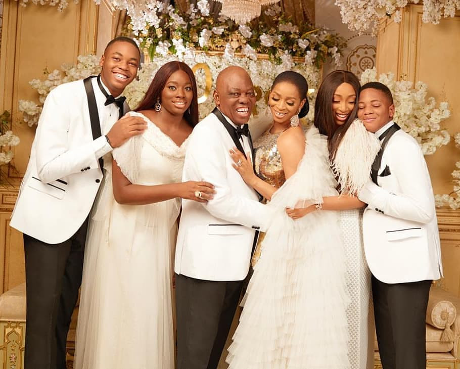 Billionaire businessman, Rasaq Okoya, and his stunning wife, Sade, are celebrating their 20th wedding anniversary today April 25th, which happens to also be Sade's 42nd birthday. Chief Rasaq, 78, and Sade got married in 1999. The couple had a photo shoot with their four children.The photos are quite lovely. See more below...