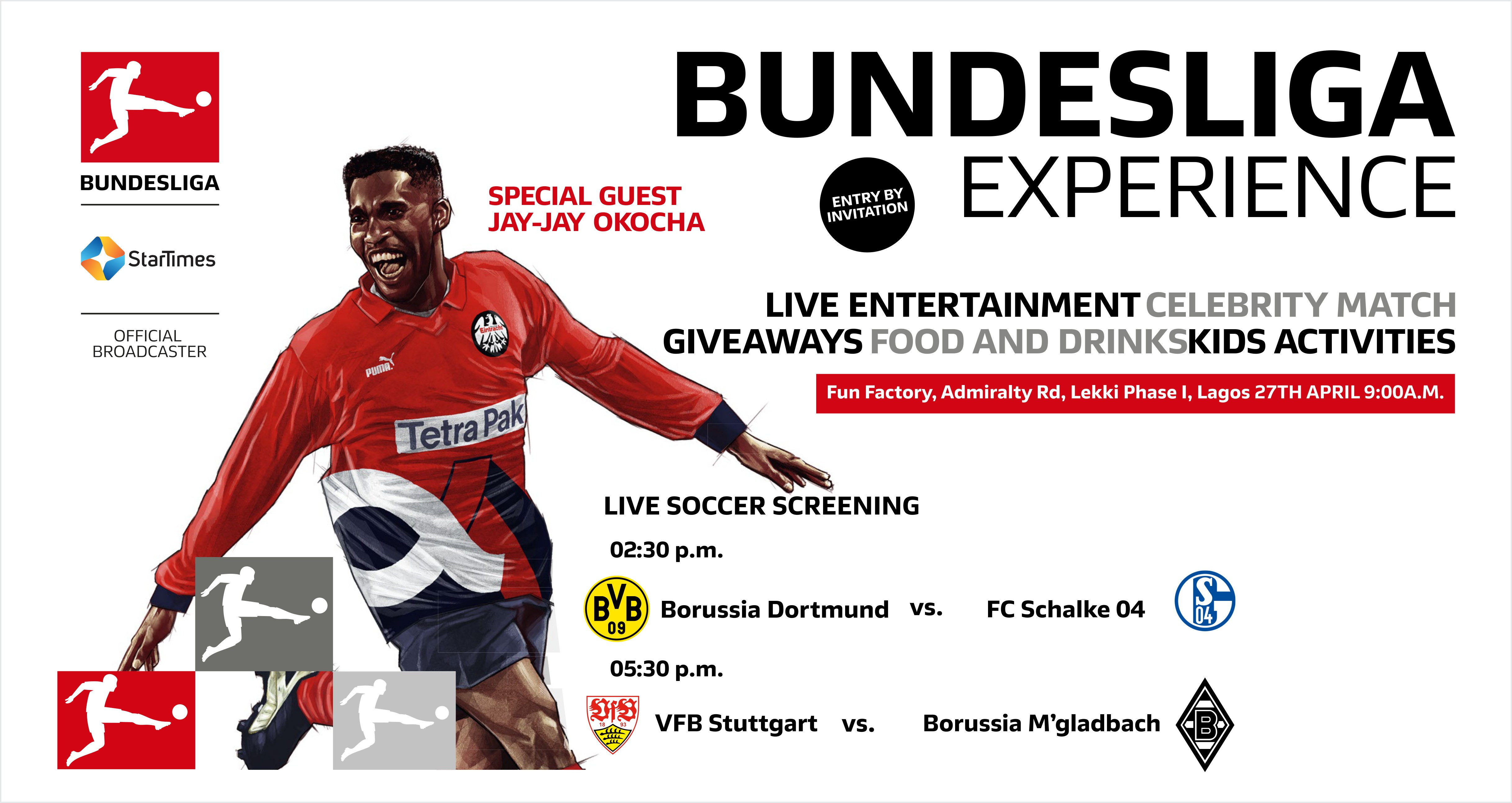 The Bundesliga Fan Fest is part of the ongoing Bundesliga Experience with JJ Okocha in Nigeria. Part of the activities for Saturday will see Okocha play in a 5 aside football Tournament with Bundesliga fans, autograph signing, live screening of Dortmund vs FC Schalke 04 match and original Bundesliga club jersey give away.Register free to attend by downloading StarTimes ON App here https://bit.ly/2UoTyCZThe post Mr. Real to thrill fans at Bundesliga Experience with JJ Okocha on Saturday appeared first on Linda Ikeji Blog.
